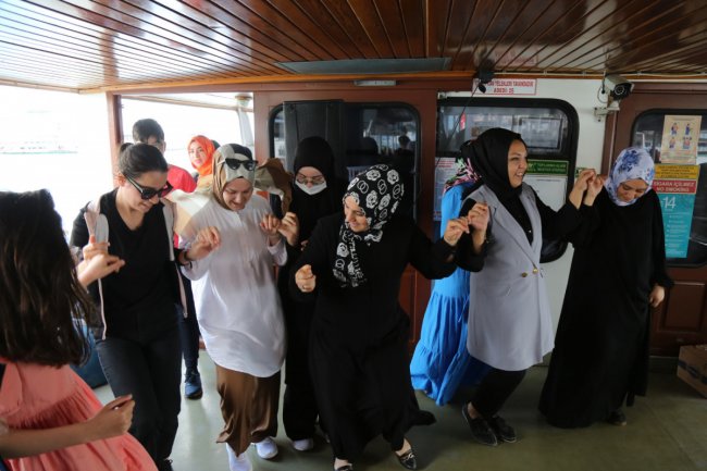Kendilerine ikram edilen meyve suyu ve simit e??li??inde bo??az?n e??siz g?zelli??inin tad?n? ??karan Ey?psultanl?lar, zaman zaman da teknede ?alan hareketli m?zikler e??li??inde bol bol oynay?p an?n tad?n? ??kard?lar.
